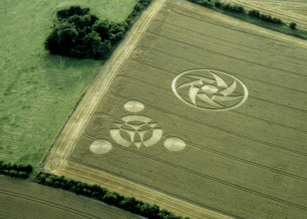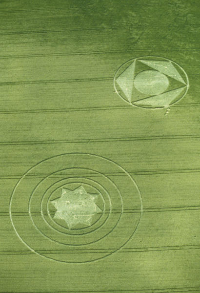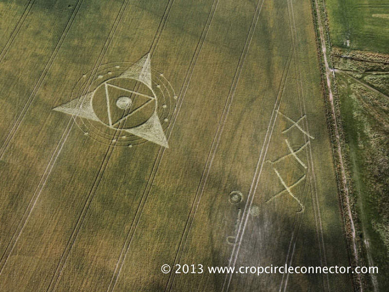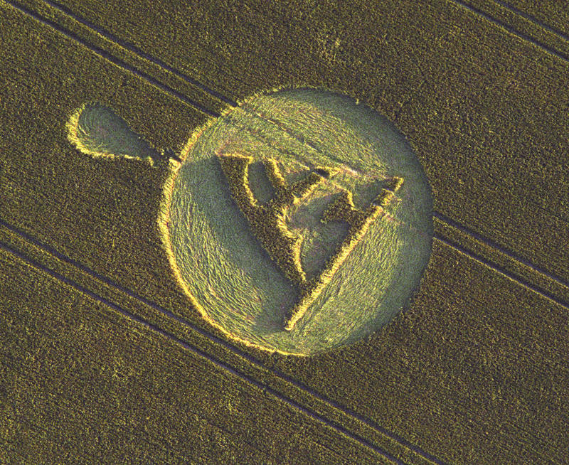 Символическое изображение Земли (треугольник) и звезда. Справа, возможно, Солнце. Круги на полях. Англия. 20 июля 1996 г.