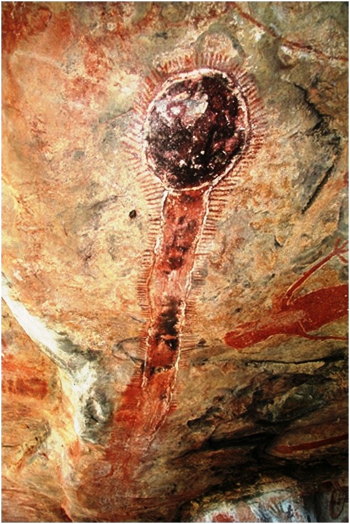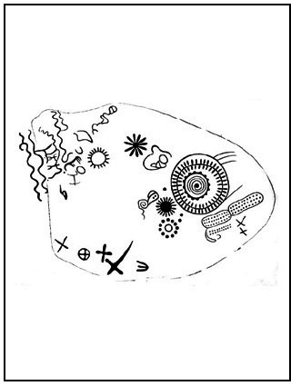 В районе древней астрономической обсерватории у горы Севсар (Армения) имеется любопытная пиктограмма, где изображена траектория прохождения звезды рядом с Солнцем. По мере сближения с нашим светилом объект изменял свою форму, направление движения, цвет и светимость. Если рассматривать траекторию перемещения звезды против часовой стрелки, на что указывает стрелка в нижней части наскального рисунка, то в начале объект выглядел, как вращающийся крест. Затем, как крест в круге. Далее изображена звезда с ее 11 спутниками и ее 2-х более мелких. При приближении этого небесного тела к Солнцу произошел выброс вещества нейтронной звезды в направлении нашего светила. Это явление выглядит как протуберанец в виде свернувшегося дракона. Под воздействием тяготения Солнца активизировались процессы выделения энергии на поверхности нейтронной звезды, и ее цвет становится белым. Извилистые линии в левой части пиктограммы – это, возможно, газопылевые облака в Солнечной системе образовавшихся в результате этой ужасной небесной «битвы»