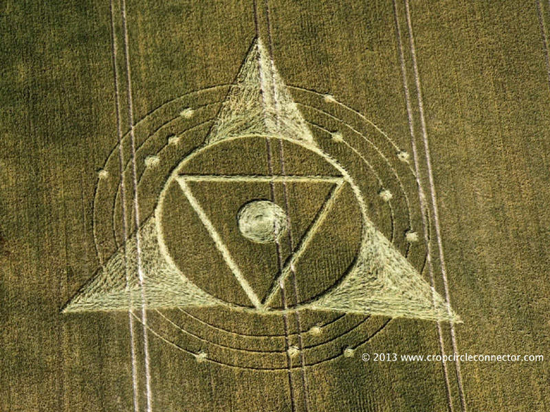 Исходя из других рисунков на полях, треугольник, трехгранная пирамида, три круга - это символическое изображение Земли. Подобные рисунки появляются на полях довольно часто.