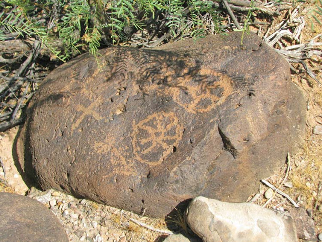 Крест - звезда и Солнце. В правом верхнем углу - крест - звезда в круге. Петроглиф. Штат Невада. США.