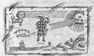 "Я поднялся на небо и вот каким образом. Я прежде всего привязал вокруг себя множество склянок, наполненных росой; солнечные лучи падали на них с такой силой, что тепло, притягивая их, подняло меня на воздух и унесло так высоко, что я оказался дальше самых высоких облаков. Но так как это притяжение заставляло меня подниматься слишком быстро и вместо того, чтобы приближаться к Луне, как я рассчитывал, я заметил, наоборот, что я от нее дальше, чем при моем отбытии, я стал постепенно разбивать склянки одну за другой, пока не почувствовал, что тяжесть моего тела перевешивает силу притяжения и что я спускаюсь на землю.