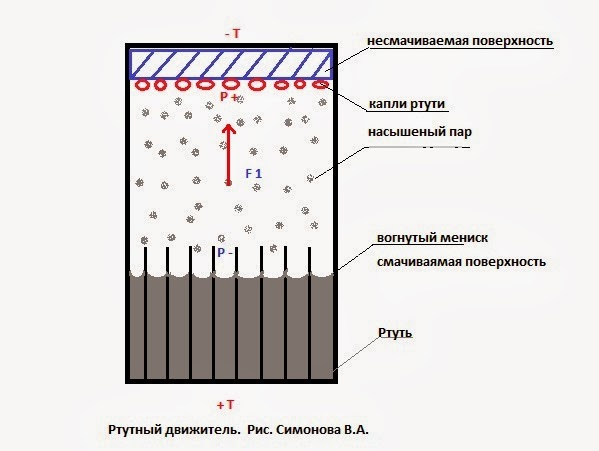 Если, в соответствием с древним описанием виманы, нагреть ртуть в замкнутом металлическом сосуде, до определенной температуры, то в результате испарения ртути в сосуде образуется насыщенный пар, который будет оседать в виде капель на верхней его поверхности, при условии создания "точки росы". В результате разницы давления насыщенного пара на выпуклую и вогнутою поверхность появляется сила F 1 направленная вверх. Подъемная сила будет зависеть от коэффициента поверхностного натяжения рабочего тела и размера капель. Чем меньше размер капель, тем больше разница давлений насыщенного пара. Эффект становится заметным при размерах капель ртути около 10 в минус 5 м.