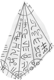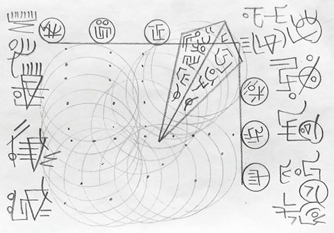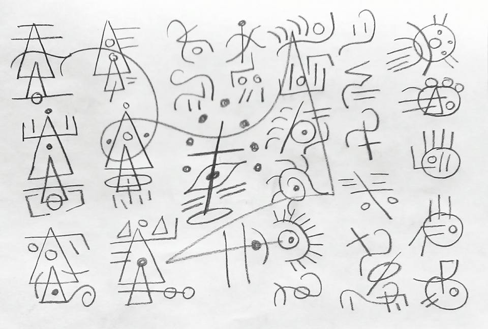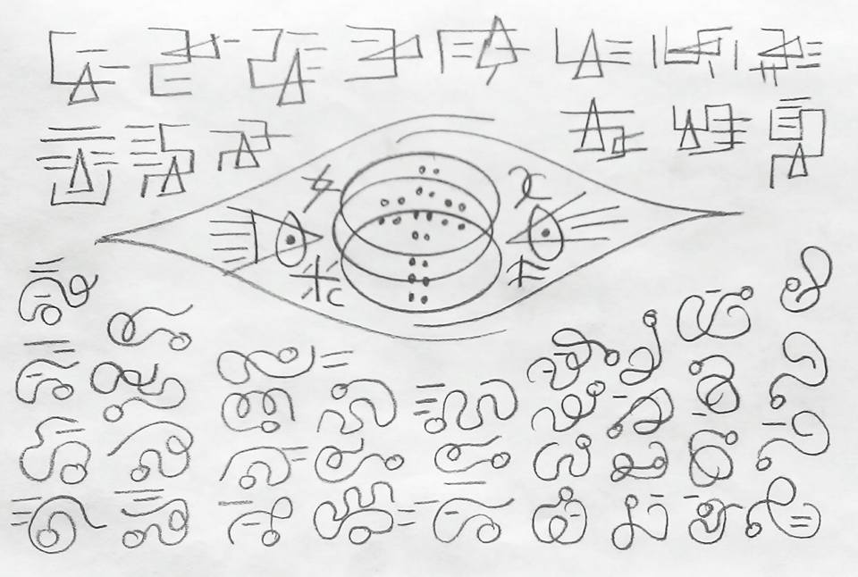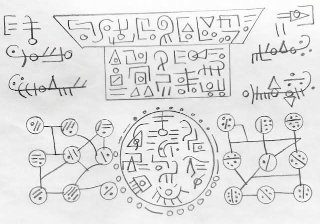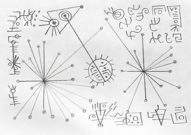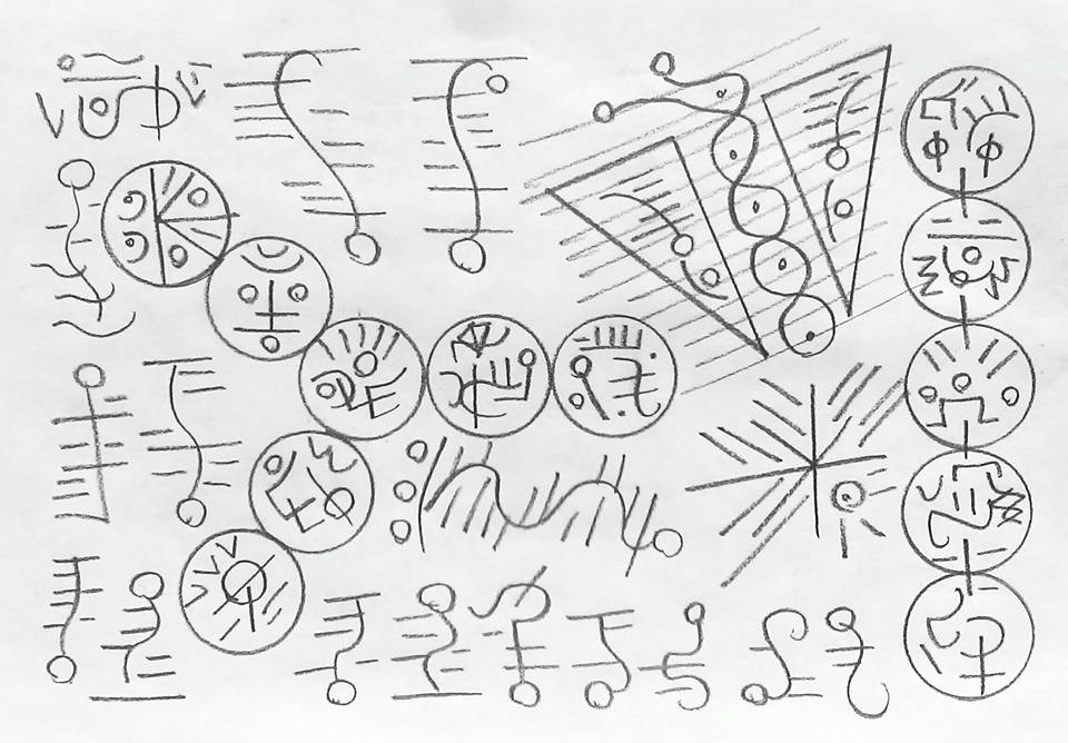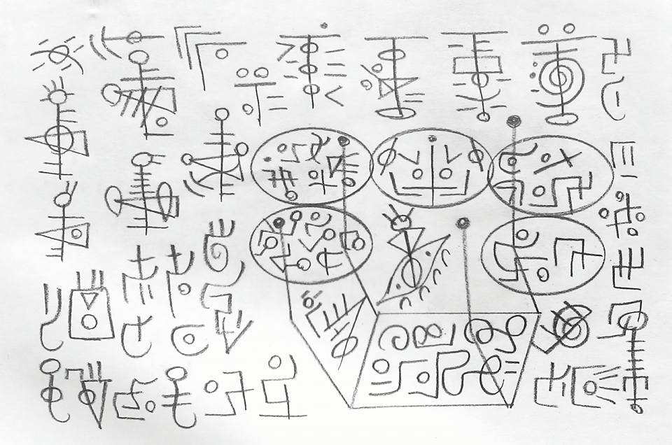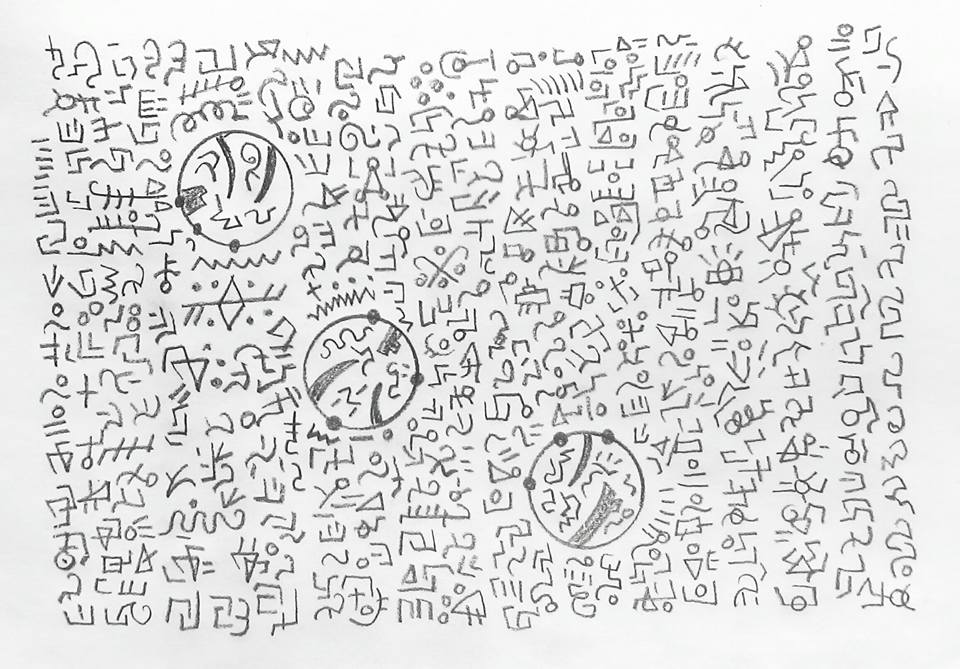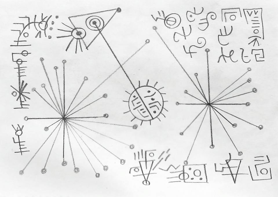 Рисунок четырехгранного космического корабля, НЛО, символы планет (кружки) и даты. Возможно, базы кораблей, которые периодически посещает Землю, находится на одной из лун Юпитера (круг с пятью точками) и Марсе.