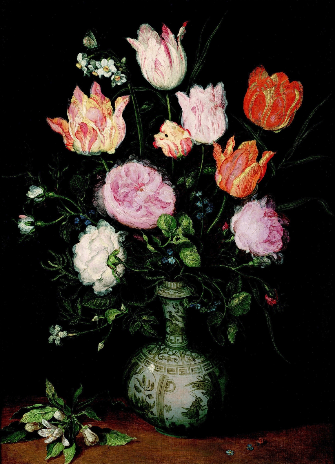 Still life with irises, tulips, roses, narcissi and fritillary in a ceramic vase