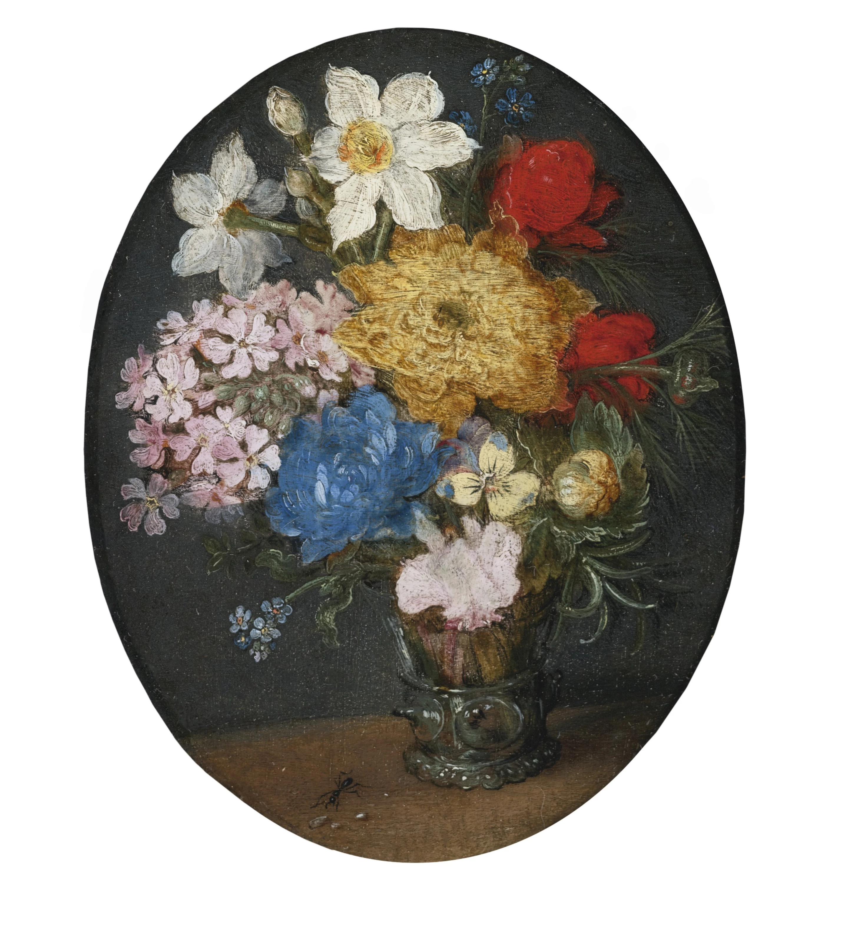 Narcissi, chrysanthemums, roses, forget-me-nots, a sprig of rosemary and other flowers in a roemer with an ant on a table