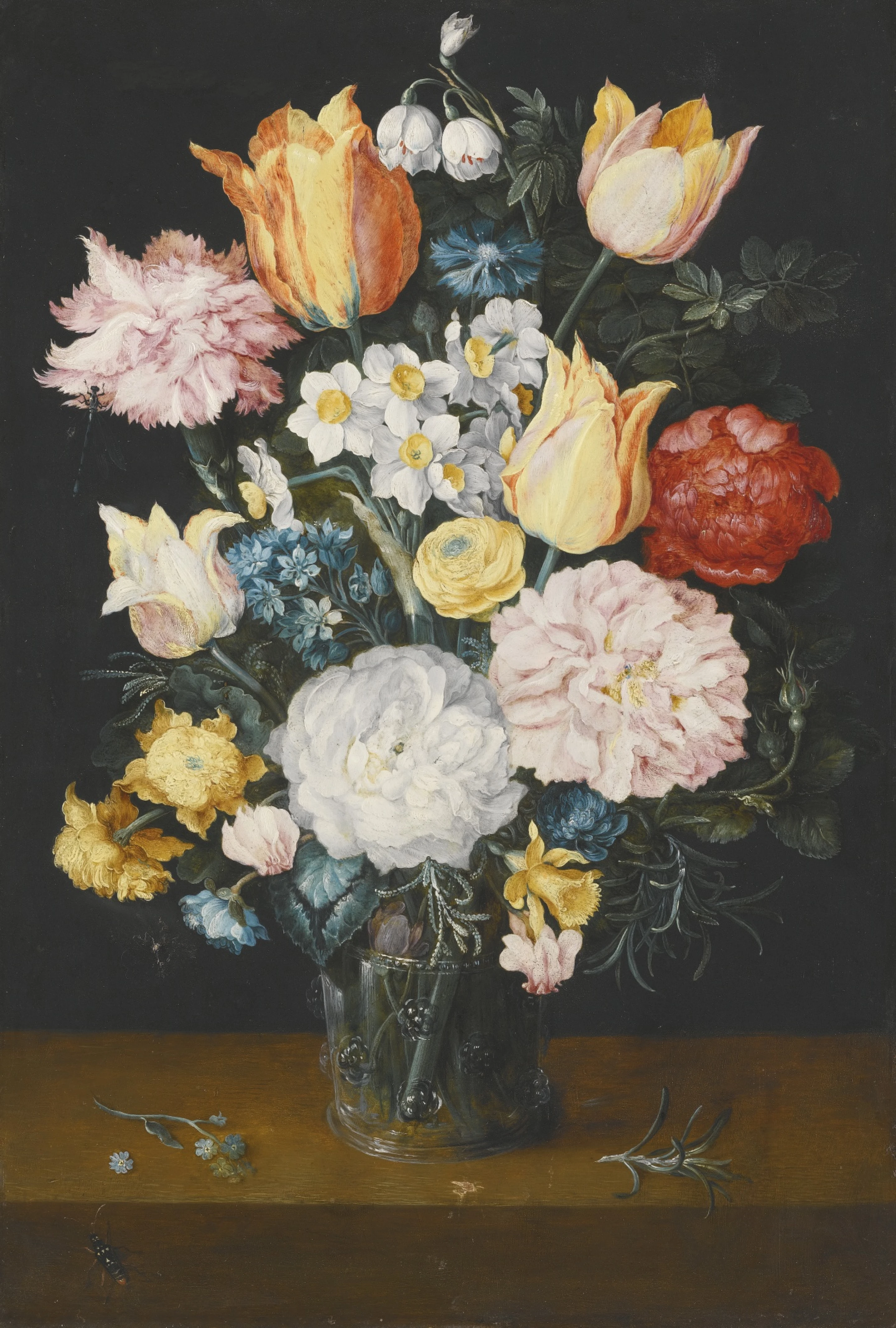 Still life of Tulips, Roses, Narcissi, Forget-me-nots, a carnation and other flowers in a glass vase, resting on a table with a sprig of rosemary and an insect