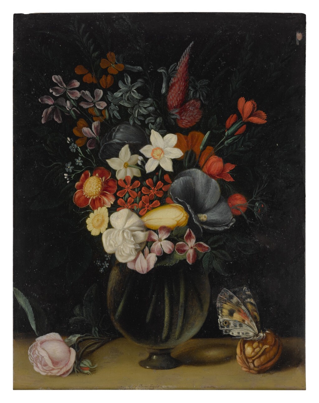 Lilies, tulips, roses and other flowers in an ornamental vase on a ledge, with butterflies and beetles