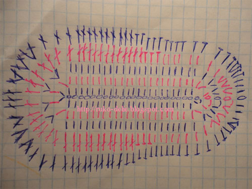 [320x240] 5-й ряд(для левой туфельки): 64 сбн, далее 23 вп-начинаем вывязывать ремешок (схема вязания ремешка ниже), 1вп подъёма, 1сбн, 3 вп,пропустив 3вп цепочки, 19 сбн, после ремешка 15 сбн до конца ряда.