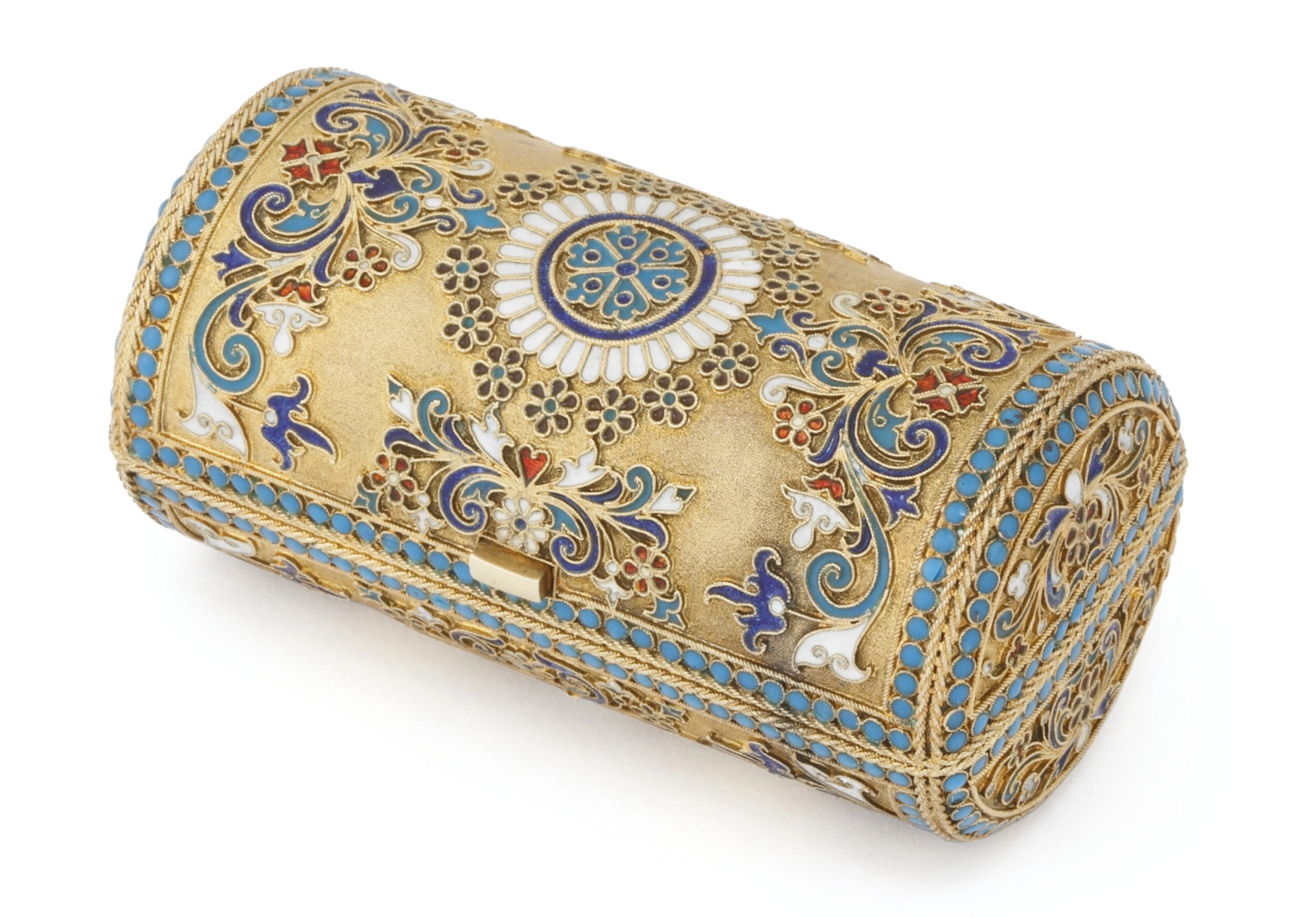 A Russian silver-gilt and cloisonné enamel lady's barrel form cigarette case, Moscow, 1886