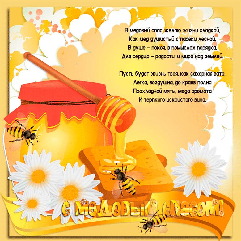 Дорогие друзья и гости! Я сердечно поздравляю Вас с Медовым Спасом!Пусть сладость мёда будет на устах, пусть сладким мёдом будет Ваше счастье, пусть вкусным, словно мёд, и ароматным будет каждый день Вашей жизни! Пусть искрится счастьем каждый миг и час! Здоровья и благополучия! |