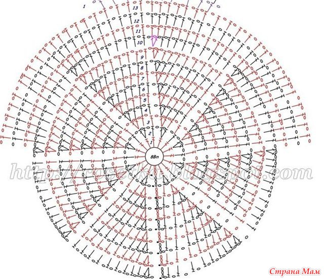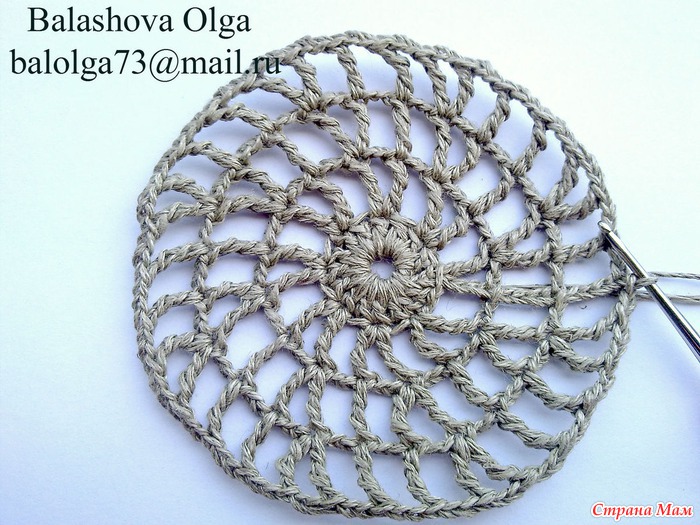 Лучше всего донышко вязать по этой схеме, только вместо 1 ст/н вяжем ст/2н, а между ст/2н вместо 1 в. п. - 2 в. п., в первом ряду вязала ст/ с одним накидом, дальше с двумя