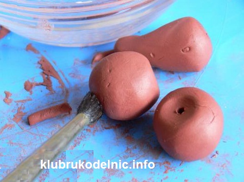 4. Из шариков сделаем яблочки и грушку. Снизу и сверху на них сделаем вмятины. Чтобы склеить отдельные детали, нужно места соединения смочить водой.