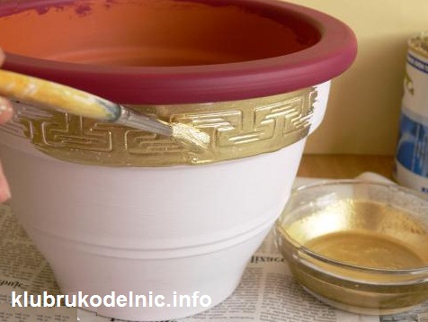 10. Верхний край горшка можем для контраста покрвсить бордовой краской а декоративную полоску под ним - золотой или бронзовой.