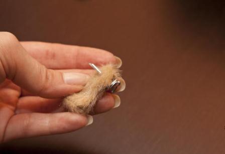 Берем нашу лапку и вместе для крепления аккуратно конусообразным шилом увеличиваем расстояние между плетения нитей, что бы наш шплинт смог пройти не повредив ткань.