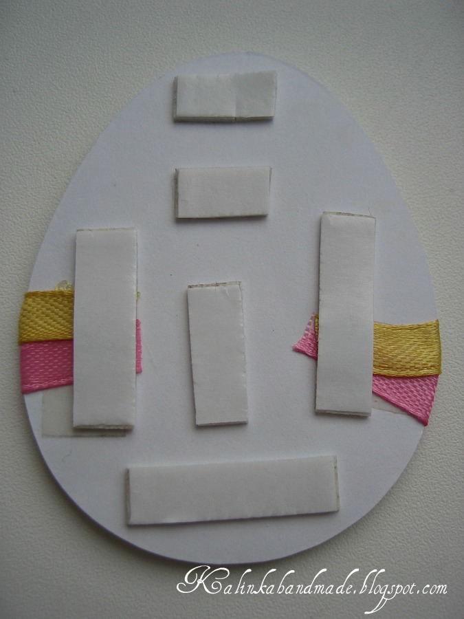 На двусторонний скотч прикрепляем атласные бантики к яйцу.