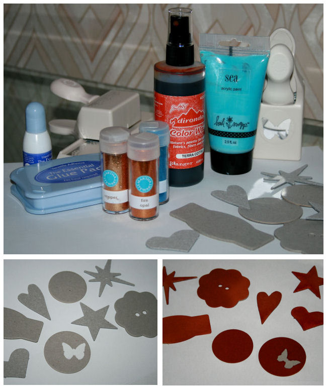 В обязательном порядке нам понадобится какая-нибудь краска-спрей (я использовала Adirondack, Terra Cote от Ranger) и на выбор - акриловая краска, дыроколы, глиттер, клеевая подушечка. Для начала с помощью краски-спрея окрашиваем все фигурки из чипборда, которые планируем преобразовать (на одну из них на временный скотч я прикрепила дырокольную бабочку).