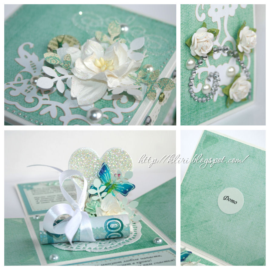 3. На окрашенном сердечке ставим штамп с помощью голубой акриловой краски, делаем акценты жидким жемчугом и стразами. Внутри открытки звезда украшена глиттером (оттиск с помощью клеевой подушечки).
