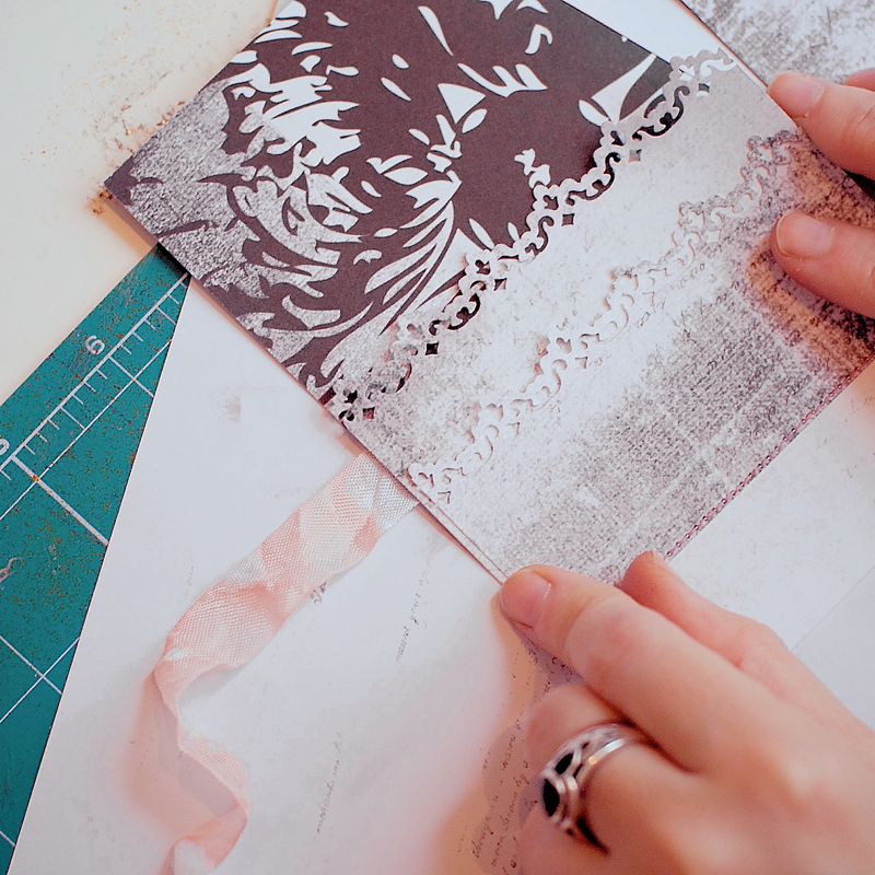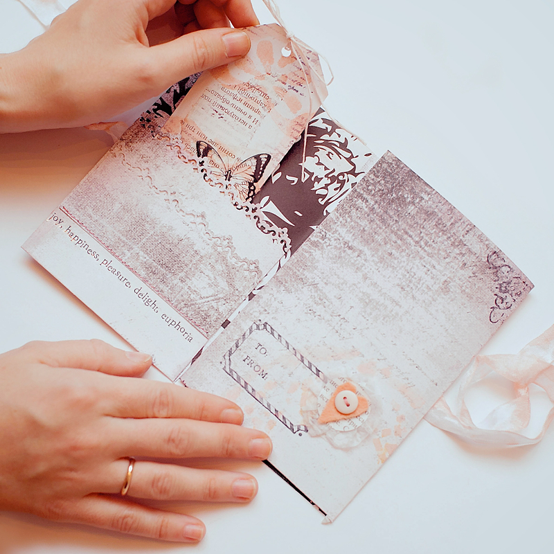 Далее вклеиваем ленты скотчем, чтобы потом закрыть карманом. Вторую ленту вклеиваем с обратной стороны открытки, декорируем. Ленты можно взять готовые или затонировать дисстресс стейном также как здесь и немного помять.