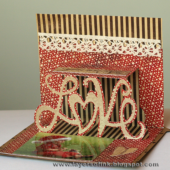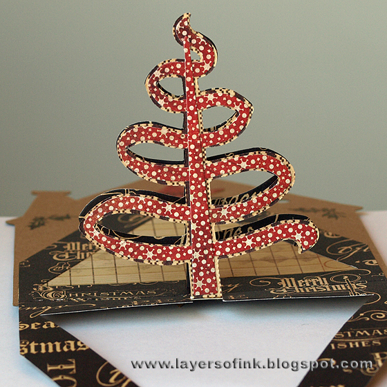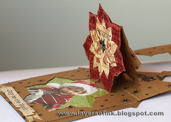 Tim Holtz's new Holiday Wreath was die cut from ledger paper and I added some white pen marks to define the leaves. The bow was die cut from kraft core and sanded lightly. You don't always have to mount pop-up on another sheet of paper. Here the star of the pop-up shows on the outside too, since I didn't mount it on another paper. When you lift the flap, you see this: