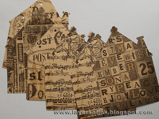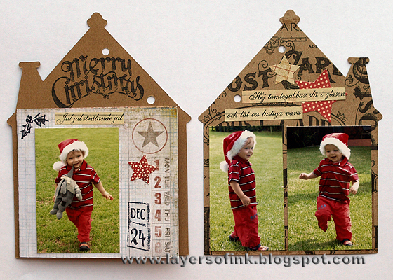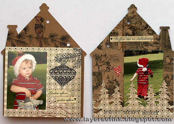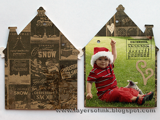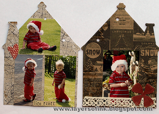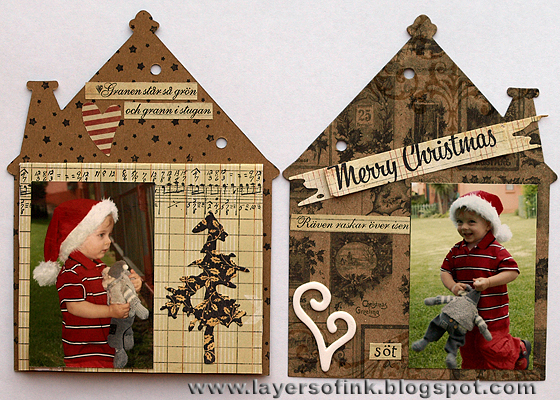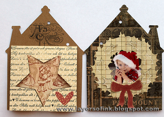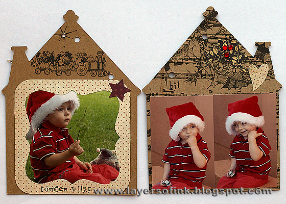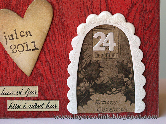This heart was inked with Antique Linen and Frayed Burlap, misted with Biscotti Perfect Pearls mist and then stamped with alphabet stamps. I used a piece of kraft resist for the door, and covered up the '25' of the paper with letter stickers, also coated with Glossy Accents. In Sweden, the main family day of Christmas is Christmas Eve.