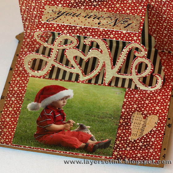 I used photos from last year's Christmas photo shoot with my son, I had developed them all, but not scrapped them yet. It's the same photos that I used on my Floating Floor pop-up tutorial from a few days ago. I decided to keep the insides relatively simple, using mainly kraft, red, and black.