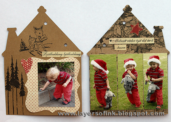 For some of the sentiments I used a stamp with Swedish Christmas songs, cutting the titles of the different songs out. Lots of stamping too of course. From scraps of the patterned papers I used, I die cut a lot of stars, and different hearts. The secret inside the album, are the pop-ups, turn the flap to the left and you find this: