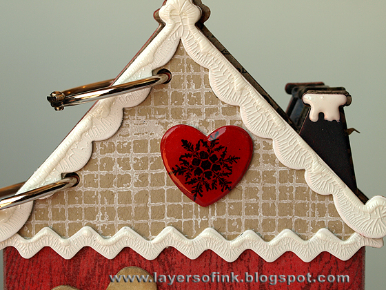 The white parts were covered with Crackle Accents and when dry I added some snow with Enamel Accents, also adding some to the chimney. The heart was inked red, stamped with a snowflake stamp and covered with Glossy Accents.