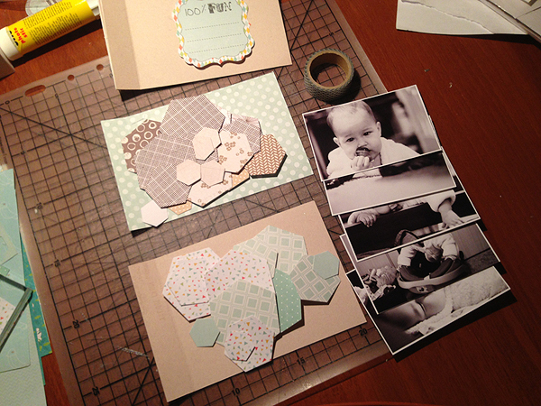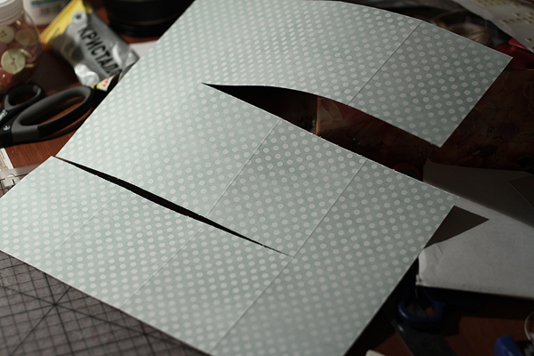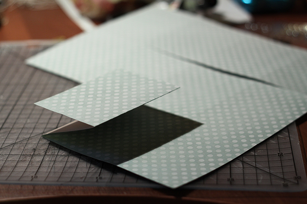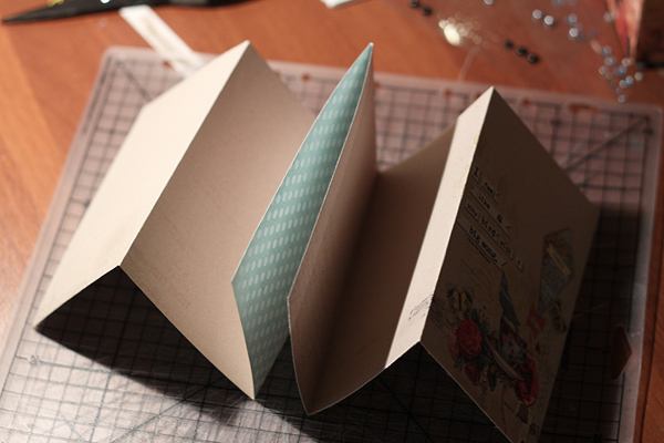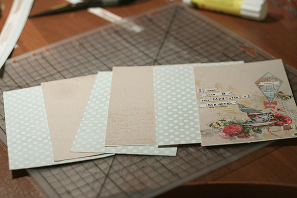 Это даже не столько раскладка, сколько схема крепления :) Берем оставшийся третий лист и разрезаем его на шесть равных частей 4х6 дюйма (10х15 см), клеим на основы такого же размера, далее, отступив по длинной стороне пару сантиметров, бигуем пять из шести будущих страничек.