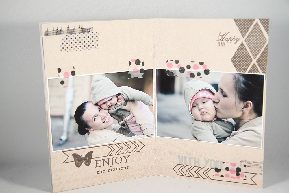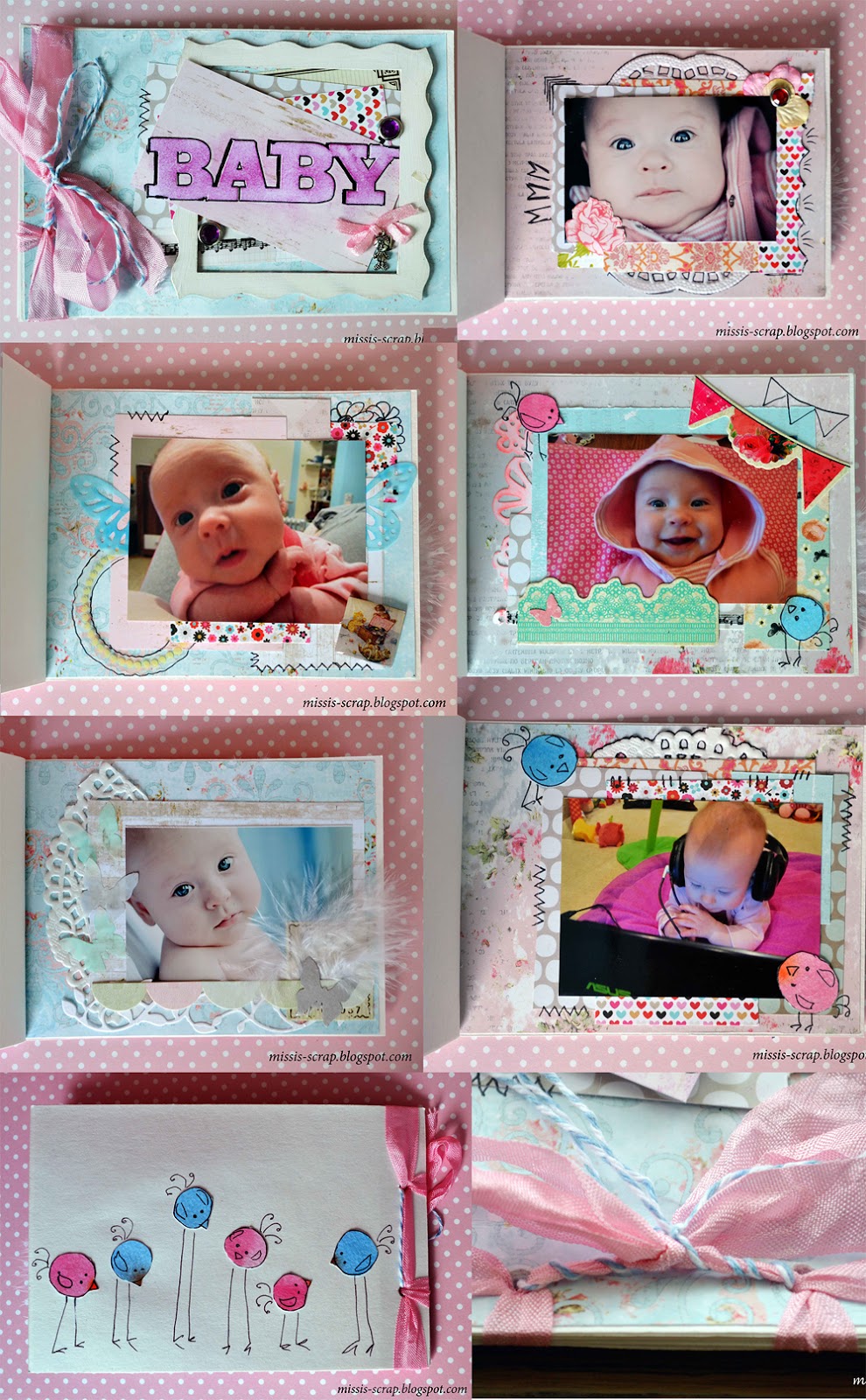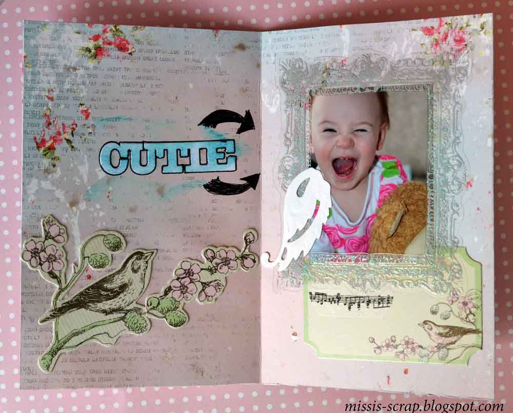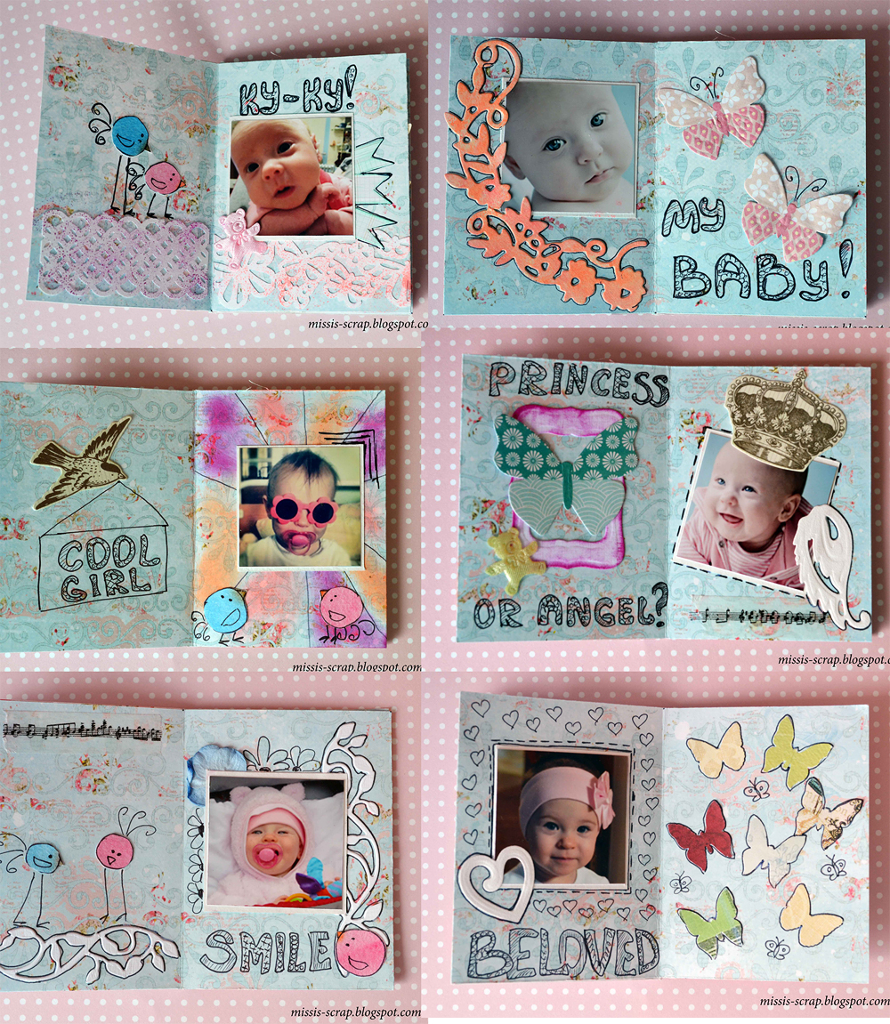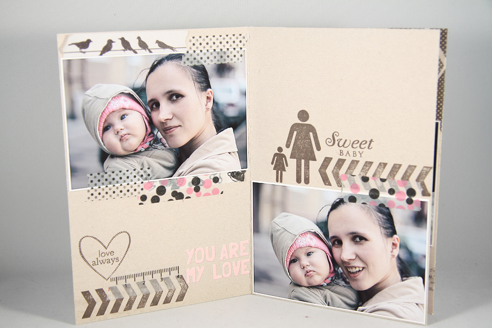 И далее опять же все оформляем по своему желанию (тут фото уже используем те, что в половину формата 10х15 см). Я использовала для оформления внутри только фотографии, штампы и скотч. Получилось что-то похожее скорее на двойную фоторамку.