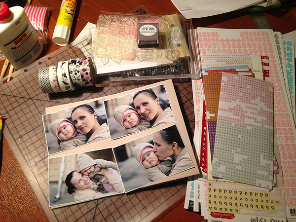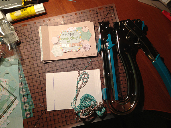Украшаем странички. Затем складываем все стопочкой (незабигованная страничка должна быть в самом низу) и делаем две дырочки. Обычно, прежде чем что-либо дыроколить (кроподайлом или биндером), я делаю черновик размером как мой лист и наношу на него разметку, чтобы дырочки получились ровные и симметричные.