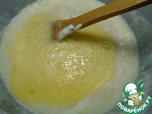 Добавить половину просеянной оставшейся муки, соду и соль, перемешать и влить масло, хорошо его вмешать в тесто.