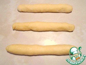 Берем по три шарика на одну булочку и раскатываем из них сначала жгутики длиной около 20см