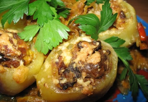 Грибы порезать, ошпарить горячей водой и спассеровать на растительном масле вместе с нарезанным луком. Картофель очистить, разрезать пополам, ложкой вынуть часть мякоти, смазать растительным маслом; заполнить фаршем картофель. Запекать в аэрогриле при температуре 260°С, средней скорости 30 мин. Сверху посыпать порезанной зеленью.