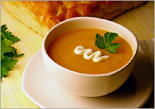 Картошку и тыкву нарезать кубиками, добавить лук (нарезанный кольцами), специи, разложить в горшочки, залить молоком с овощным бульоном, закрыть крышкой. Готовить при температуре 260°С 50 мин. Подавать с подсушеными орехами или семечками и потертым твердым сыром.
