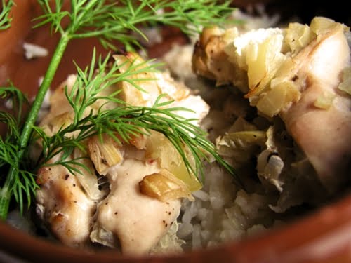 Выкладывать в горшочек слоями, в такой последовательности: филе или две половинки грудки курицы, зелень, чеснок и перец, тертые помидоры с солью, полукольца лука. Добывать немного горячей воды. Закрыть горшочек крышкой, готовить на нижней решетке аэрогриля 50 минут при температуре 260 градусов. Скорость высокая.