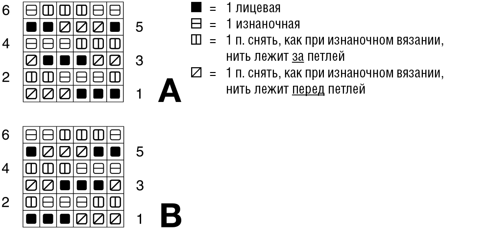 Вязать по схемам А и В. В ширину повторять раппорт из 6 п. между кромочными. В высоту повторять с 1-го по 6-й ряд.
