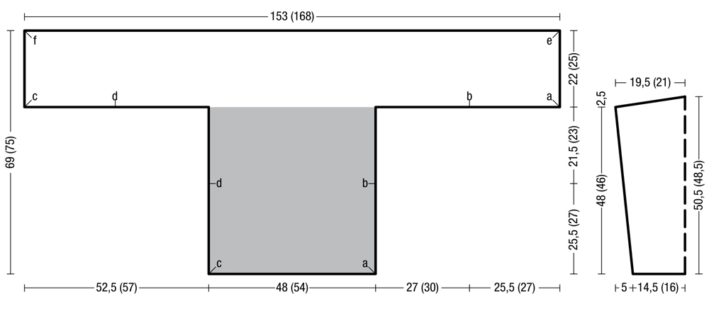 Для планок и шалевого воротника набрать на круговые спицы серой нитью по краю от а до е (= нижний край правой полочки) 40 (45) п., 272 (296) отложенных петель от е до f провязать лицевыми и от f до с (= нижний край левой полочки) набрать еще 40 (45) п. = 352 (386) п. На всех петлях вязать 2 р. лицевой гладью, при этом во 2-м р. на уголках е и f перед и после угловой петли из протяжек вывязать по 1 лиц. скрещенной петле. В следующем лиц. ряду первые и последние 40 (45) п. временно оставить и только на средних 272 (296) п. провязать следующие 2 р., при этом на правой полочке через 44 (48) п. = 20 (22) см от нижнего края закрыть для отверстия для пуговицы в изн. ряду 3 п. и эти петли вновь набрать (изн. ряд довязать до конца). В следующем лиц. ряду все петли закрыть.