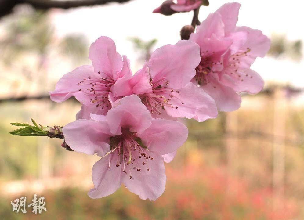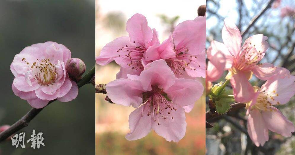 Цветки сакуры распускаются один за другим, и многие путают цветение сливы, персика и вишни. Слева направо на картинке изображены: цветущая слива, цветущий персик и цветущая вишня. (Фото: KFBG Kadoorie Farm and Botanic Garden)