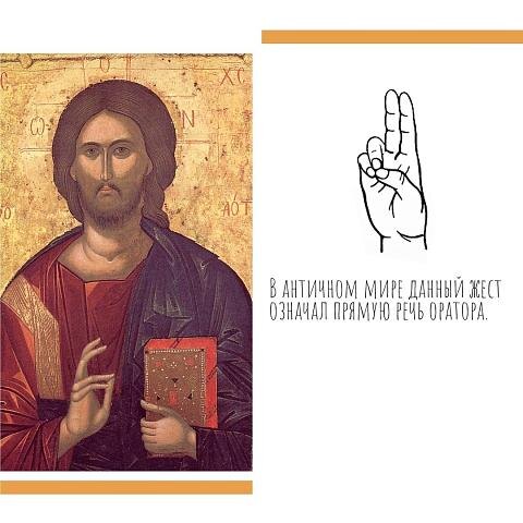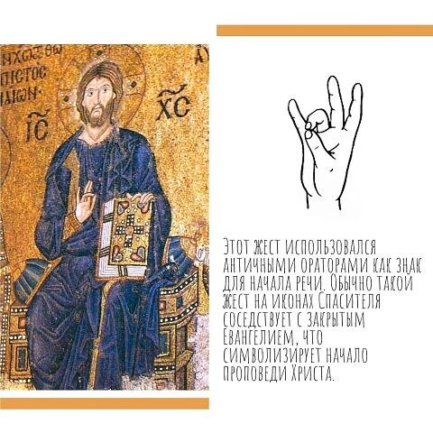Часто на иконах с изображением Спасителя, особенно в сценах «Спас Вседержитель» или «Спас Благое Молчание», мы видим, что Его правая рука поднята, а пальцы сложены следующим образом: большой и безымянный соединены в кольцо, средний и указательный чуть согнуты, а мизинец прямой. Это — жест оратора, начало речи.