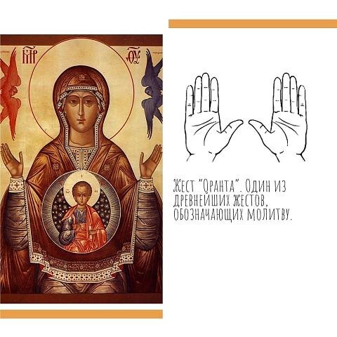 Один из самых величественных и мощных жестов. Святой (чаще всего Богородица «Оранта») стоит с воздетыми к небу руками, ладони раскрыты наружу. Это древнейший жест молитвы и заступничества.