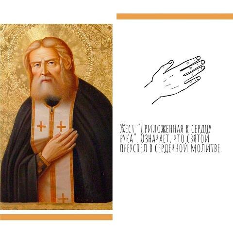 Иногда святой изображается с обеими руками, раскрытыми перед собой ладонями вверх. Это жест принятия и открытости. Он говорит: «Я ничего не скрываю, я весь перед Тобой, Господи. Да будет воля Твоя». Этот жест выражает полное доверие Богу и готовность принять от Него все, что Он ни пошлет — радость или скорбь. Он часто встречается у мучеников, с радостью идущих на страдания за Христа.