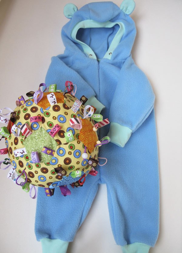 К желтому мячу сшился еще вот такой комбинезончик из флиса. Только резиночку пока еще не купила. А к красному мячику оставшаяся часть подарка будет сделана чуть позже.