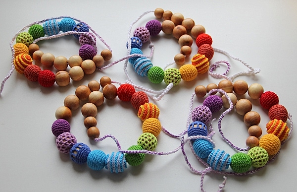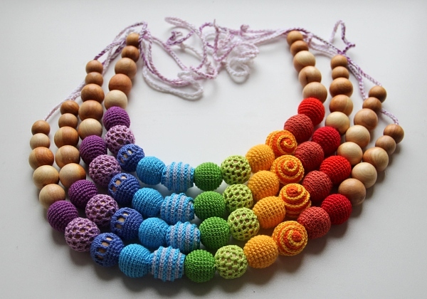Таких радужных слингобус я связала много в этом сезоне. Бусы фактурные и очень ароматные можжевеловые. Продаются на Ярмарке мастеров.
