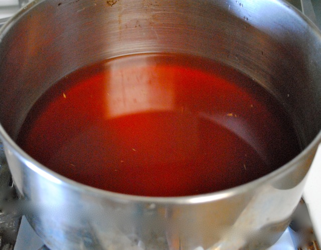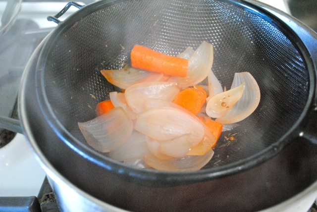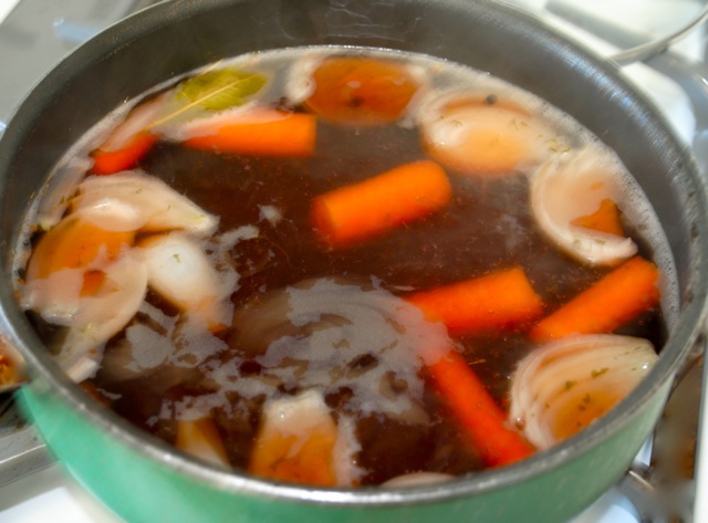 [Кастрюлю или сотейник, в котором будет готовиться рыба, нужно подбирать так, чтобы куски рыбы уместились на дне в один слой, а бульон покрыл бы рыбу целиком.] Доводим процеженный бульон до кипения, уменьшаем огонь до маленького.