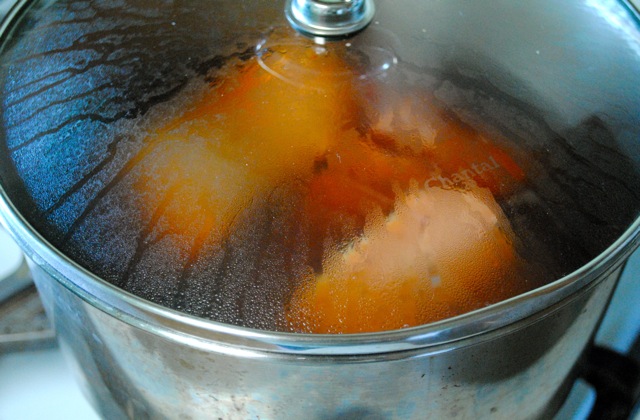 Кладем куски филе в кастрюлю с бульоном, увеличиваем огонь, доводим до кипения и сразу же выключаем. Не кипятим!