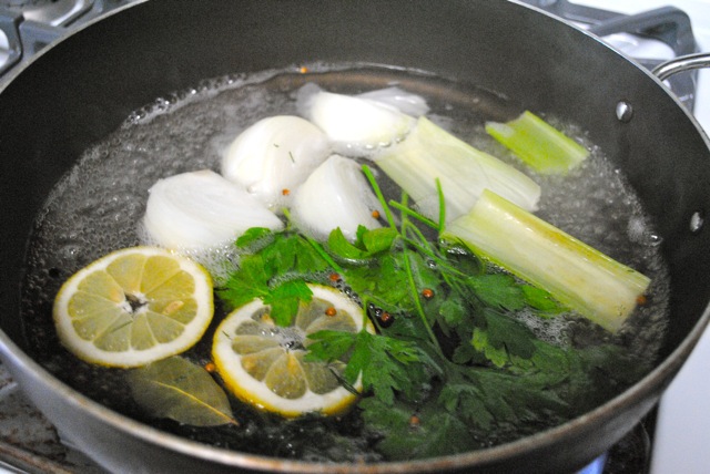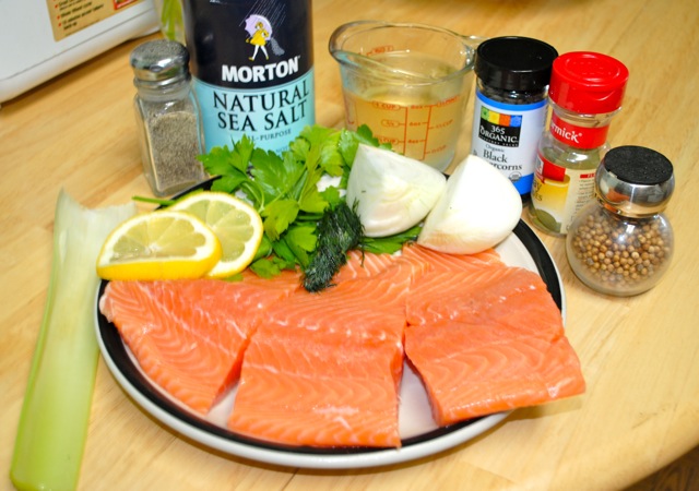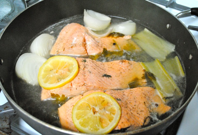 Филе лосося - это настоящая палочка-выручалочка для занятого кулинара. Хлопот никаких, готовится быстро, вкус чудесный, вид элегантный. Обычно я лосось просто запекаю в духовке или готовлю на гриле, но сегодня я решила попробовать новый способ приготовления рыбы - в сковороде в небольшом количестве воды и вина. Это один из традиционных способов приготовления рыбы во Франции, и здесь в США припущенная рыба тоже довольно популярна. Нам очень понравилось: вкус у лосося нежный, легкий, "диетический", и в то же время интересный. Вино и специи придают блюду элегантность, и рыба совсем не кажется "просто вареной" и скучной. Очень рекомендую!