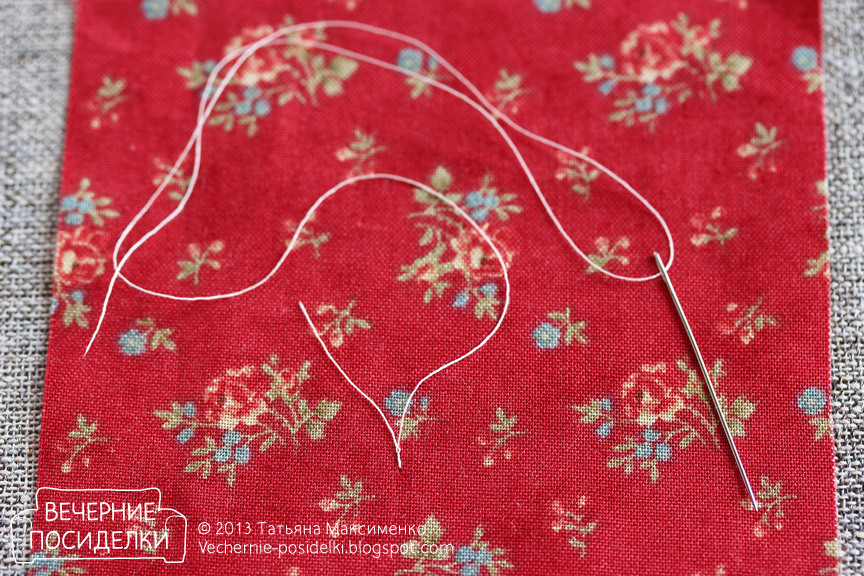 Ну и если уж речь зашла о ручных строчках, отвечу на частый вопрос «куда прятать узелки» в начале работы при ручном шитье или стёжке. Никуда, можно шить без узелков. Приём, показанный ниже, известен всем вышивальщицам. Когда я начала активно вышивать лет пять назад и узнала про этот приём, у меня прям разрыв шаблона случился. Это же надо, с детства вручную шить и не знать о таком. :-) Итак, если надо шить двойной ниткой, то надо сложить её так, чтобы на конце образовалась петля.