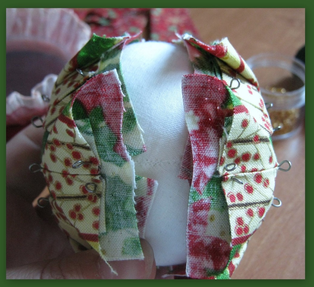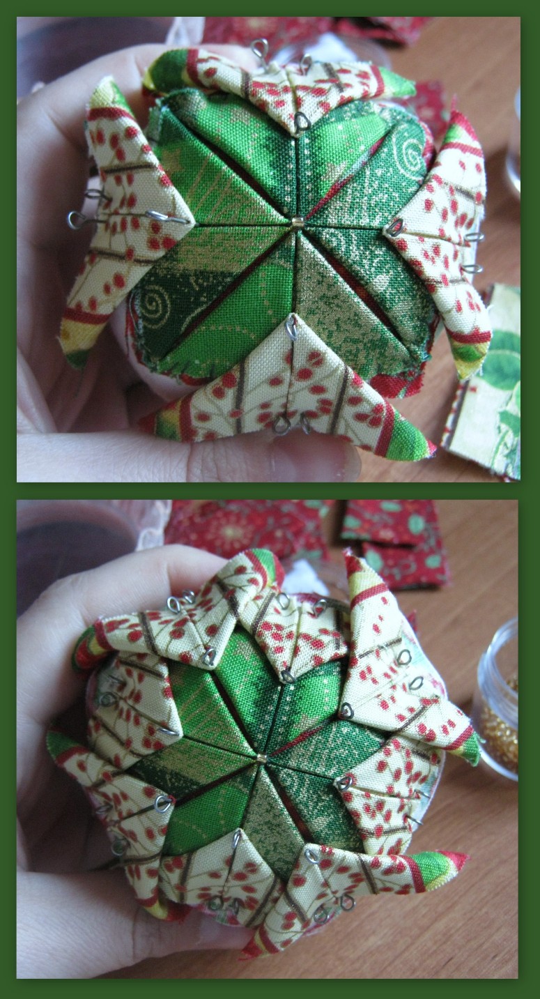 Итак, шьем шарик из ткани, выкройку брала тут, вырезаем 8 квадратиков 5Х5 для центрального мотива и по 16 квадратиков для лучиков. Шарики у меня получились диаметром 7,5 см, размер квадратиков определяла опытным путем. Да еще нужно 2 квадратика для подложки под центральный мотив.