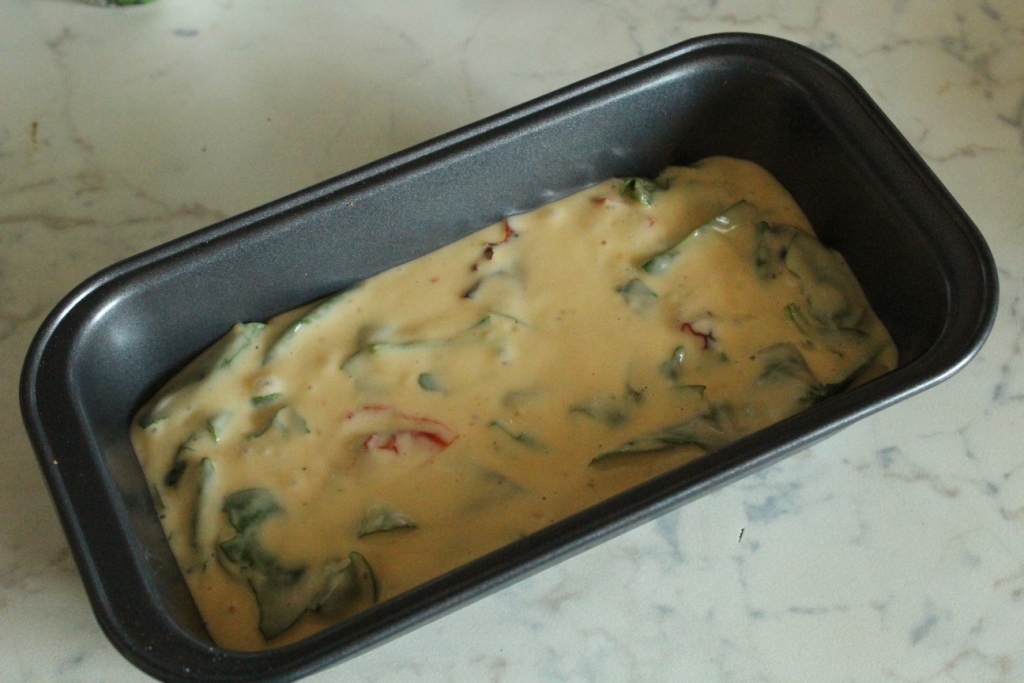 Добавить в тесто помидоры и шпинат, перемешать, добавить соль и перец.