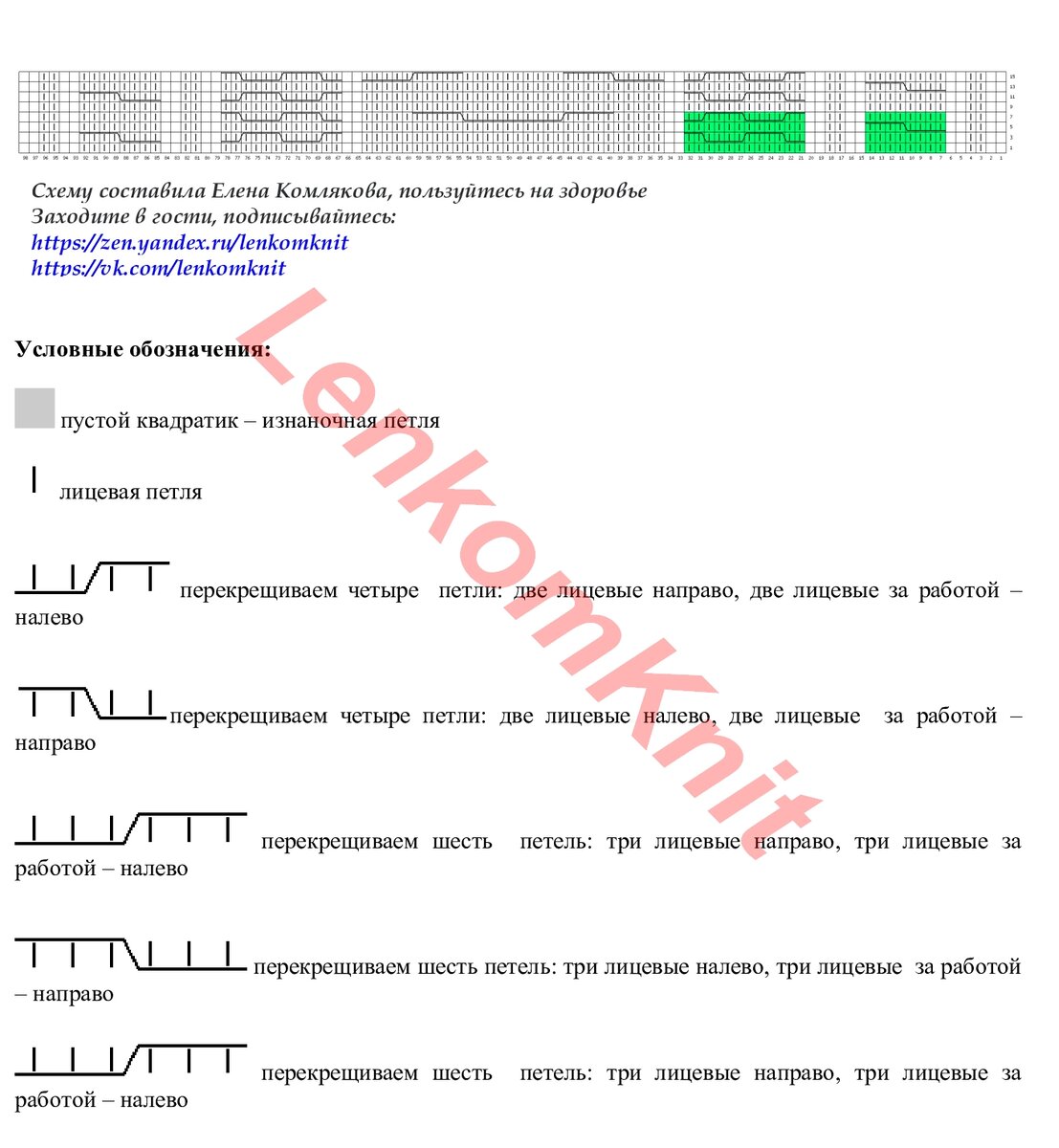 На рисунке - схема узора, раппорты жгутов выделены зеленым цветом. Между двумя жгутами вяжется жемчужный узор, который переходит еще и на внутреннюю половинку косы.